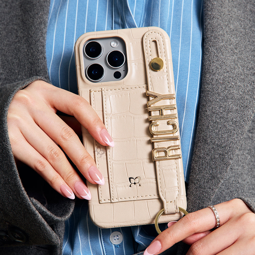 iPhone Case with Hand Strap Card Holder Phone 15 Pro Max in Beige